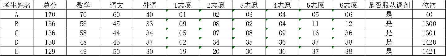 假设本次考试一共有3000名考生参加,考试成绩出来后,按照总分从高分到低分排序1-3000名。同分考生按照录取规则中顺序排序,如B、C总分相同,则比较数学分,数学分也相同再比较语文分,语文分B>C,所以B排在C前面。表格中有A、B、C、D、E五名考生成绩和志愿信息,6个志愿中编号为专业代号,位次一列对应各自在所有考生中的排名。例:A考生170分为第40名。